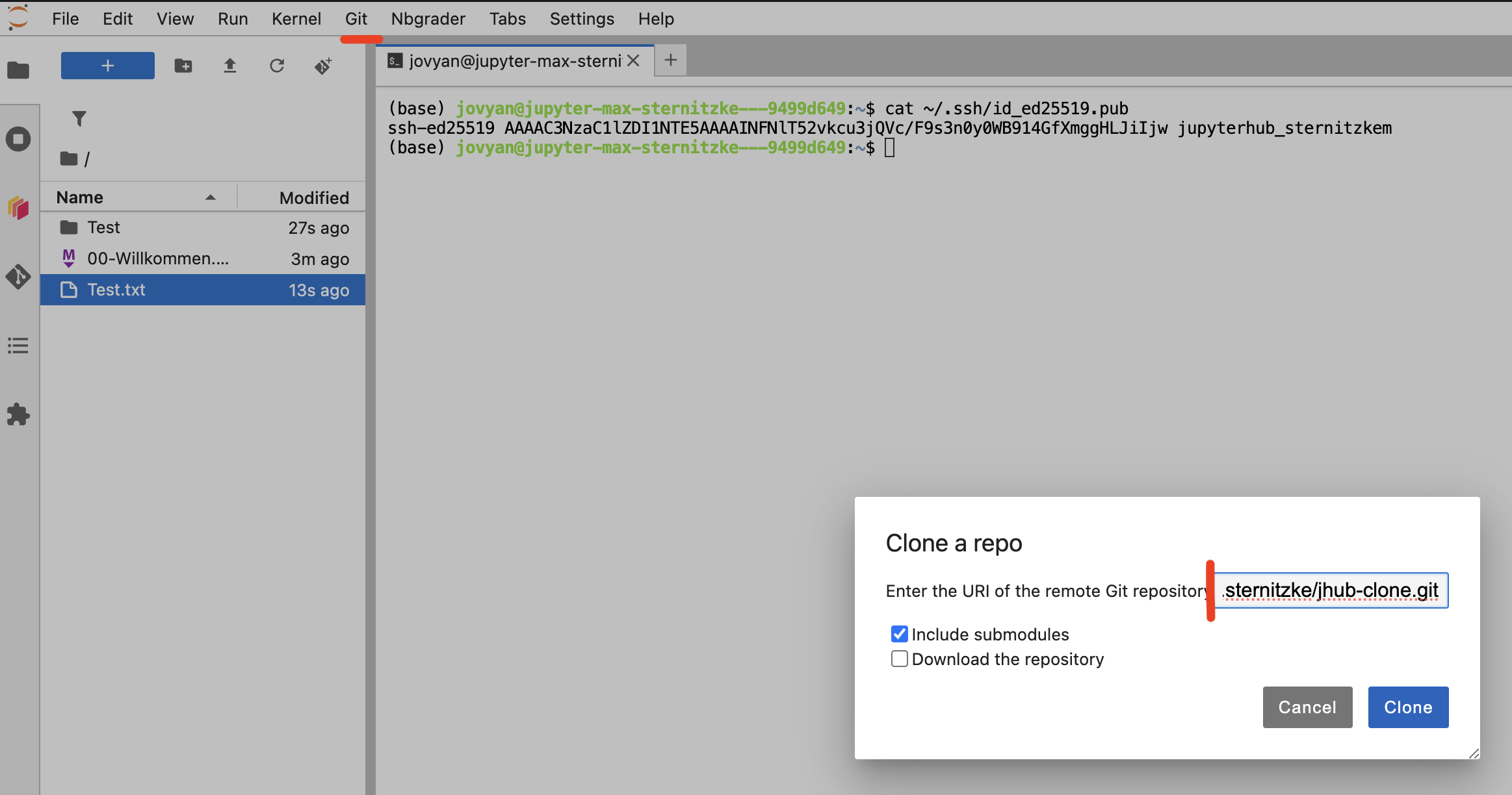 Mit diesen Zugangsdaten kannst du nun über das Git-Menü im JupyterHub ein Repository klonen oder Daten in ein Repository pushen. Das Git-Menü findest du im Menü am oberen Bildschirmrand.