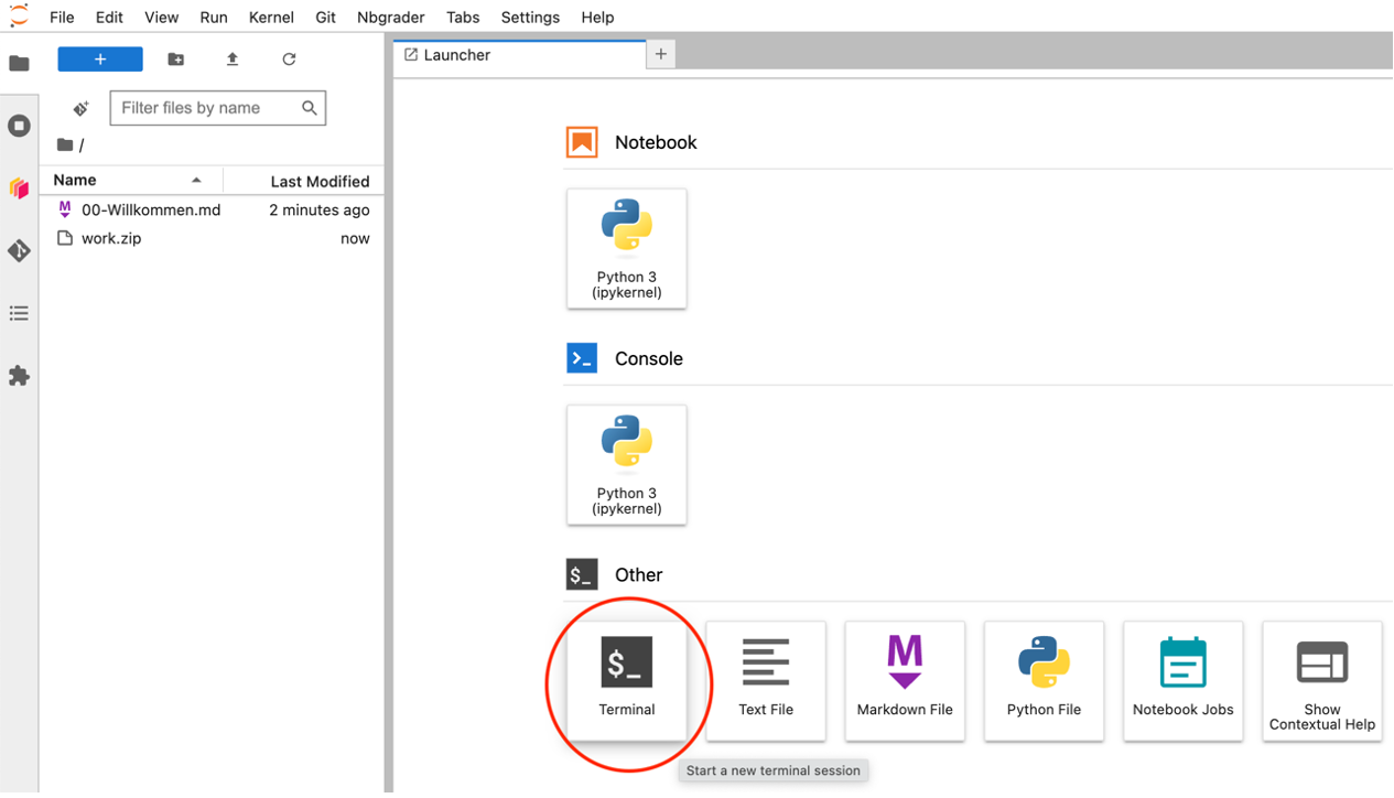 Du kannst Daten aus dem JupyterHub einfach in ein Git-Repository übertragen oder Daten von dort in dein Jupyter-Notebook herunterladen.